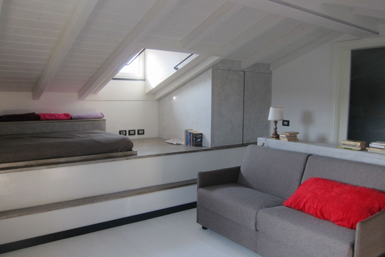 Situato al terzo piano di una tipica casa ligure (senza ascensore), regala una vista aperta sui tetti del centro storico.